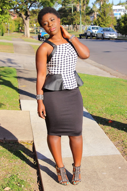 So this weeks outfit was a combination of polka dots, leather and the peplum trend (which I love so much)!!! I wore this black bandage type midi skirt, with a polka dot peplum top that had leather accents. I bought this top earlier on in the year from Little JC, along with the skirt, but this is actually my first time wearing it. I love this top, because it gives the most amazing waist!! (which i can't complain about) lol